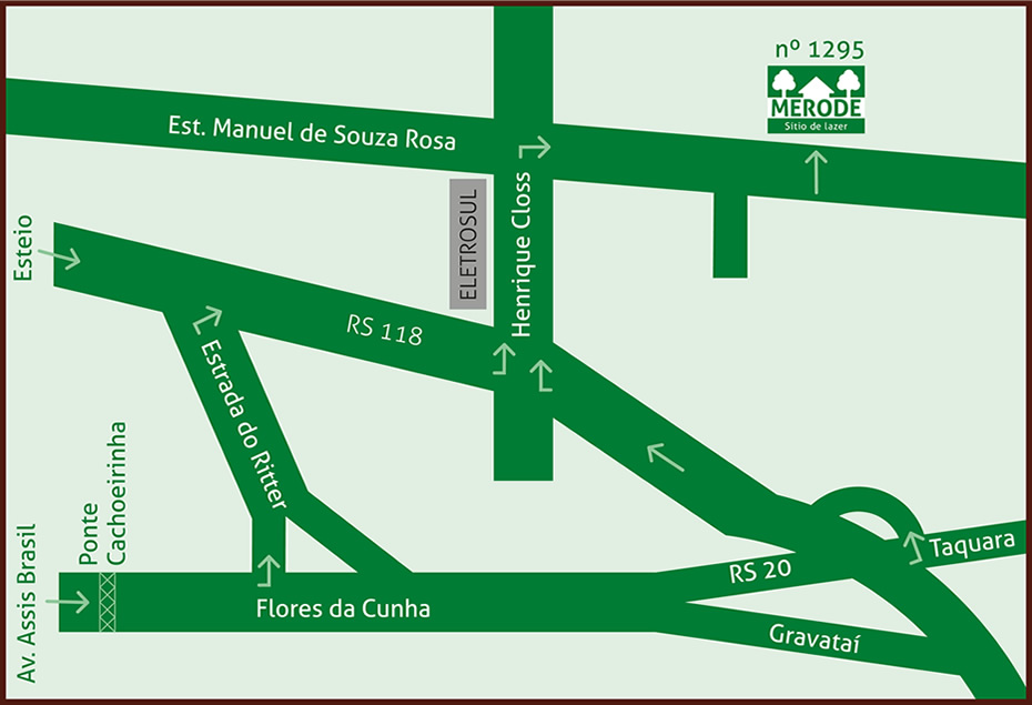 O Sítio Merode está localizado na Grande Porto Alegre, a 18 km da FIERGS, em Gravataí, a 2800 metros da RS- 118. Nosso endereço: Rua Estrada Manoel de Souza Rosa 1295 (Antiga Estrada da Mangueira), Bairro Costa do Ipiranga.